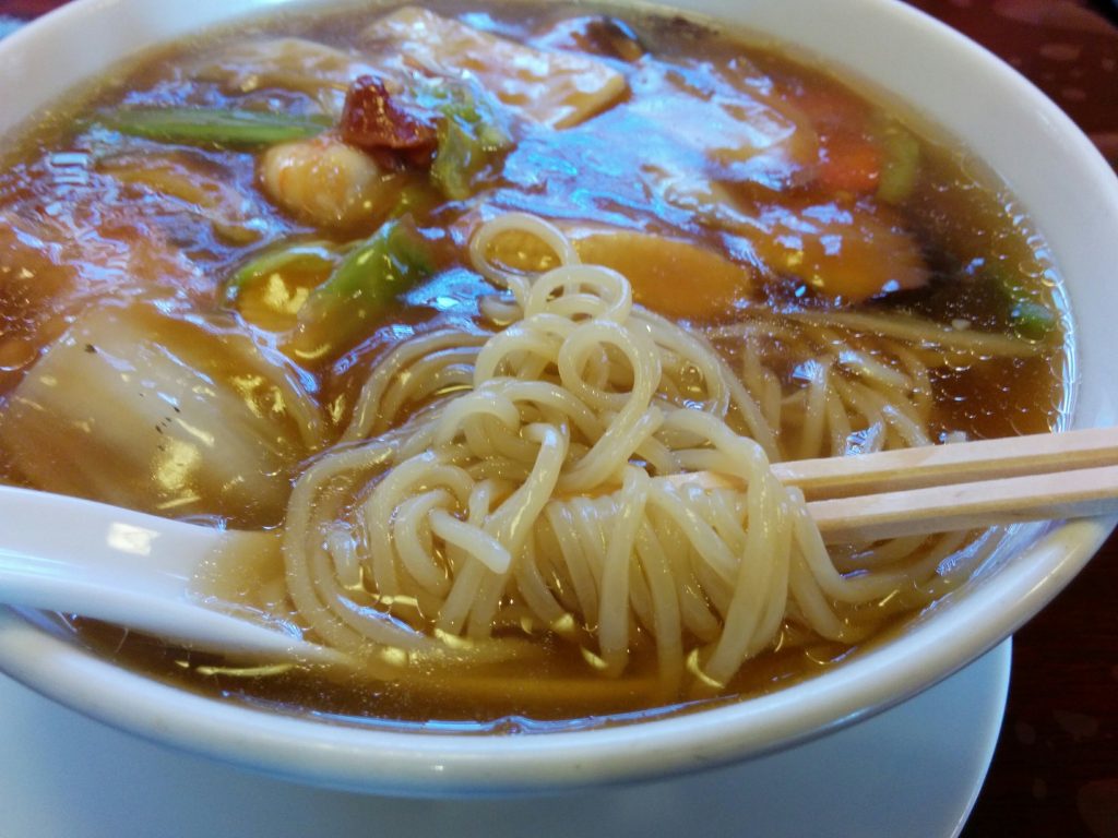 普段よく食べる えびラーメン の優しいあっさり味も大好きですが、醤油の効いた濃厚な五目ラーメンのスープは、すすった時口内に広がる旨味・パンチ力が違いますね。