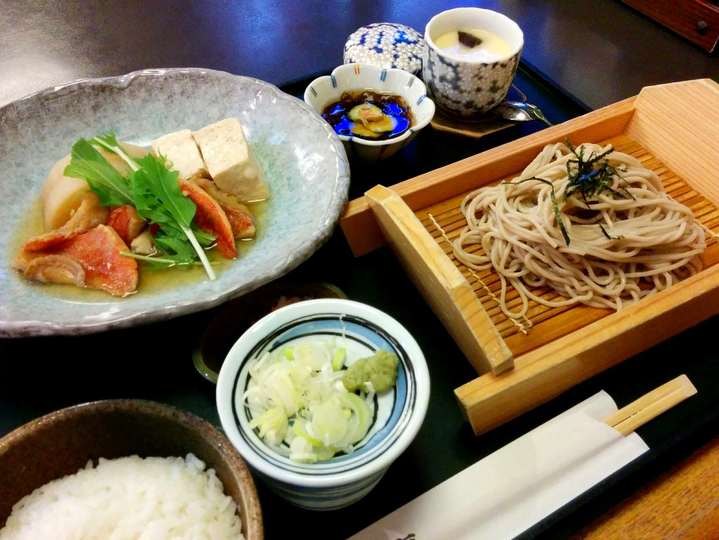 赤魚の煮付け御膳 1166円(税込)、味噌汁→ざるそば変更+194円(税込)