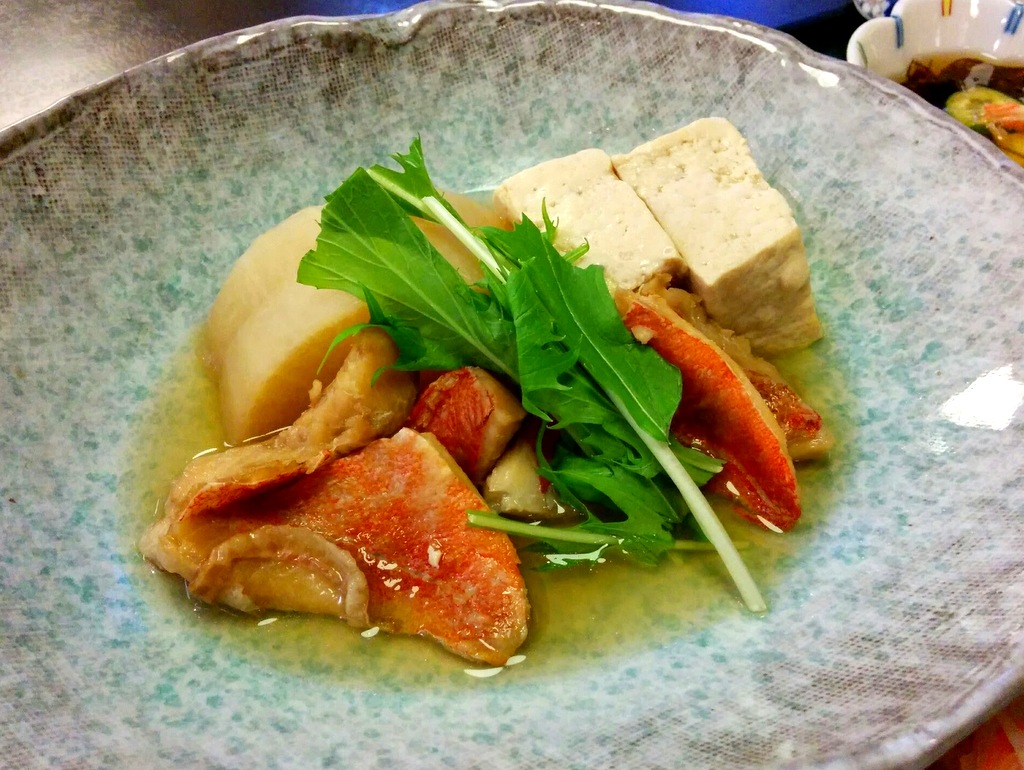 出汁で煮付けた赤魚、大根煮付け、豆腐に水菜を添えた一品。