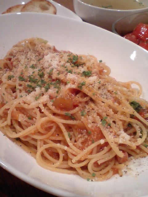 N課長は日替わりパスタランチ「ベーコンと野菜のトマトソース」。