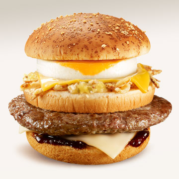 ビーフパティとステーキフィリングが、スモーキーな風味をかもしだす!3段バンズと、色違い2種類のチーズ(チェダー、モッツァレッラ)、エッグ、ビーフパティが高くそびえ立つ、迫力満点の一品☆