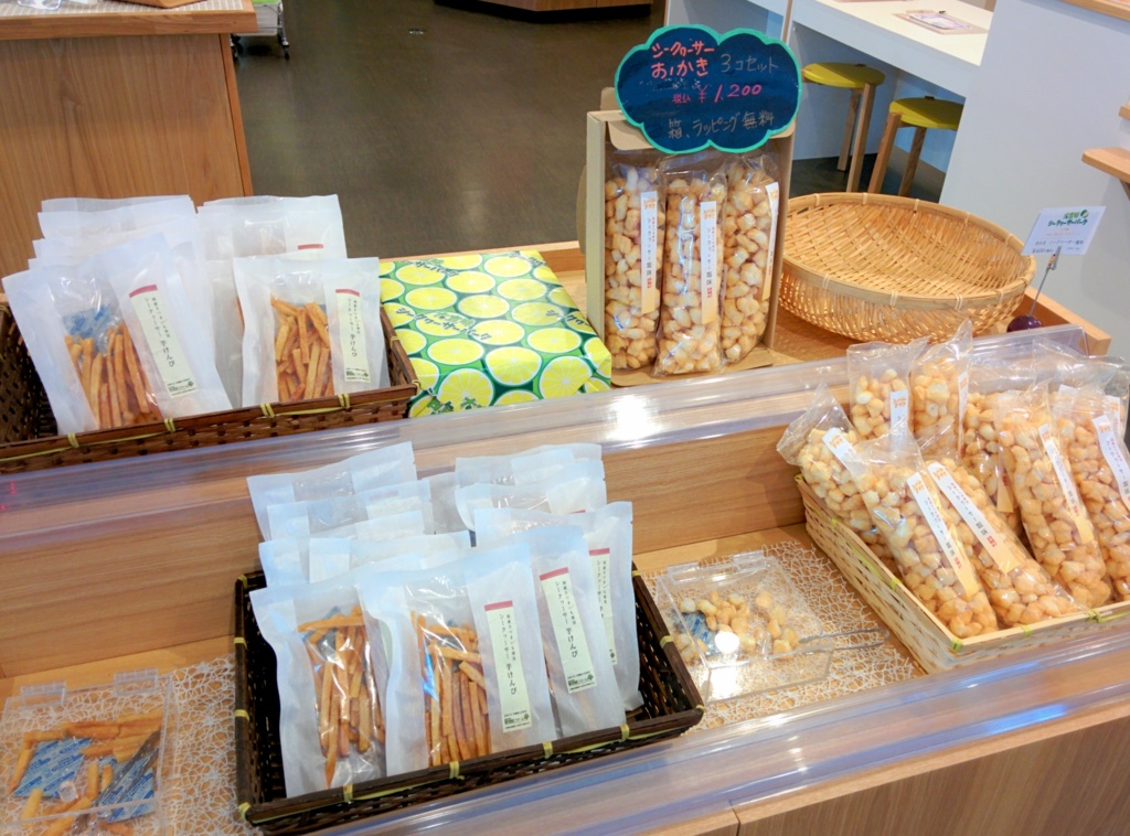 菓子は シークワーサーおかき、芋けんぴ、れんこん など、いずれもシークワーサーを使用。いずれも すっぱ爽やかな風味 が広がり、唾液もの。好きな人にはたまらんな~。
