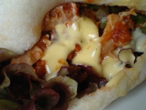 トリッパとは牛の第2胃袋・ハチノスのトマト煮込み。これを自家製アリオリソース、レタスと共にサンドにしたのがトリッパサンドらしい。