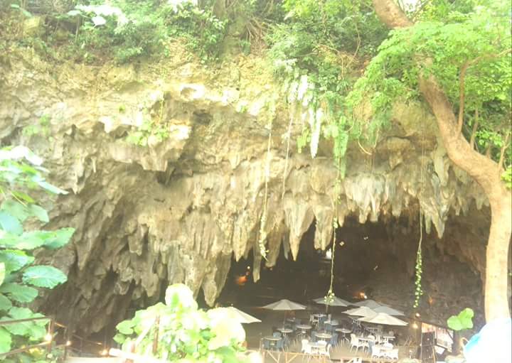 鍾乳洞の上の部分から、たまに水滴が、落ちるので、各テーブルに、パラソルが、立てられています。