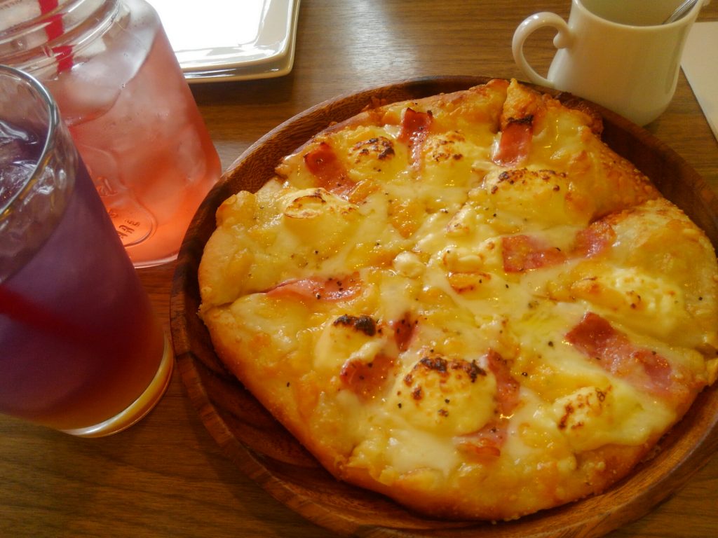 ピザ🍕をオーダー。10種類くらいありました。今回、ゴーダチーズ➕ベーコンのピザんをオーダー。熱々、うまうまで、ぺろり😋