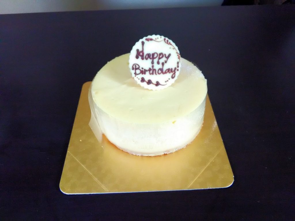 バースディケーキは、ベイクドチーズケーキを注文しました。「HAPPY BIRTHDAY」ってプレート付けてくださいってお願いしたら、ケーキの上にいちごをのせて、ホワイトチョコでプレートつくっていただけました。