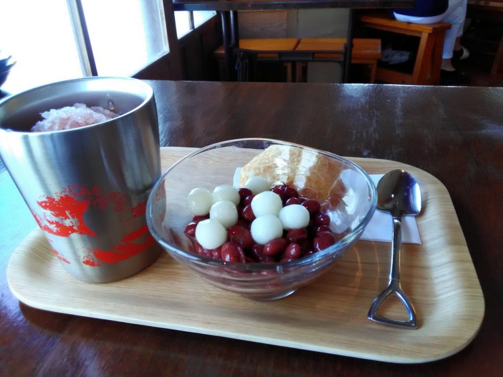 金時豆の煮汁を凍らせているので、かき氷も甘みがついています。がりがりした粗めの氷が特徴です。金時豆はふっくらと煮てあって、たくさん入った白玉はつるんした食感が楽しいです。