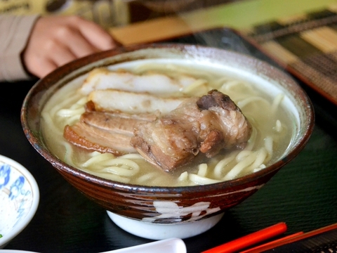 沖縄そばは、うっすらと白濁したスープに、名護では細目の平麺、その上には三枚肉と本ソーキ、かまぼこがトッピングされています
