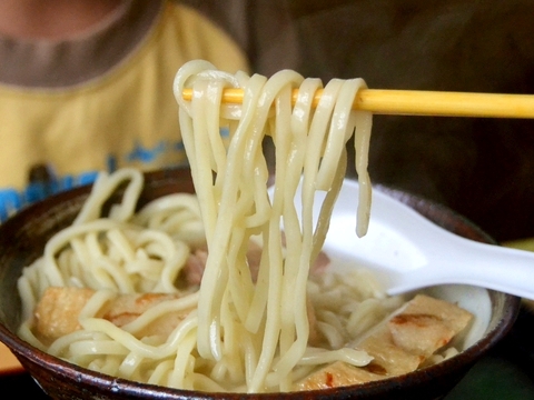 麺をすすると、豚骨ベースの優しい旨味が口の中に広がります