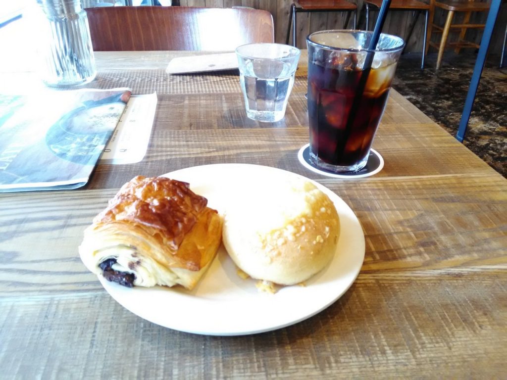 私はパルメザンチーズとチョコクロワッサンを店内で食べることにしました。スープと迷いましたが、暑かったのでアイスコーヒーを注文しました。