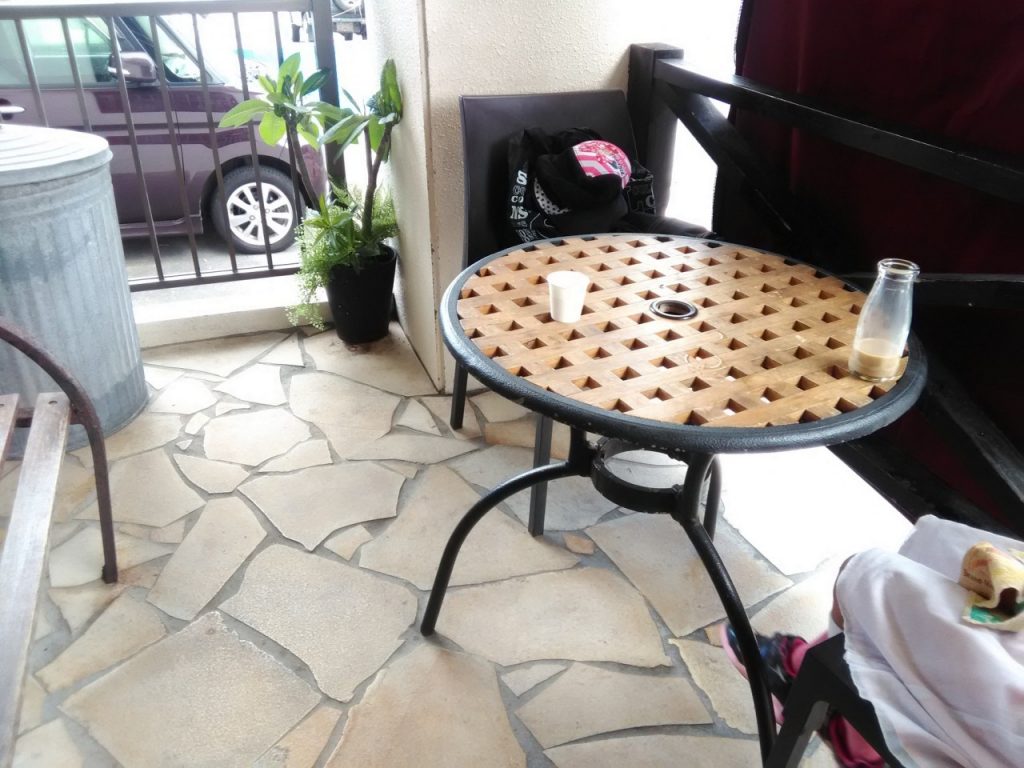 受け取ると温かい!これはラッキーと思って、テラス席で食べることにしました。