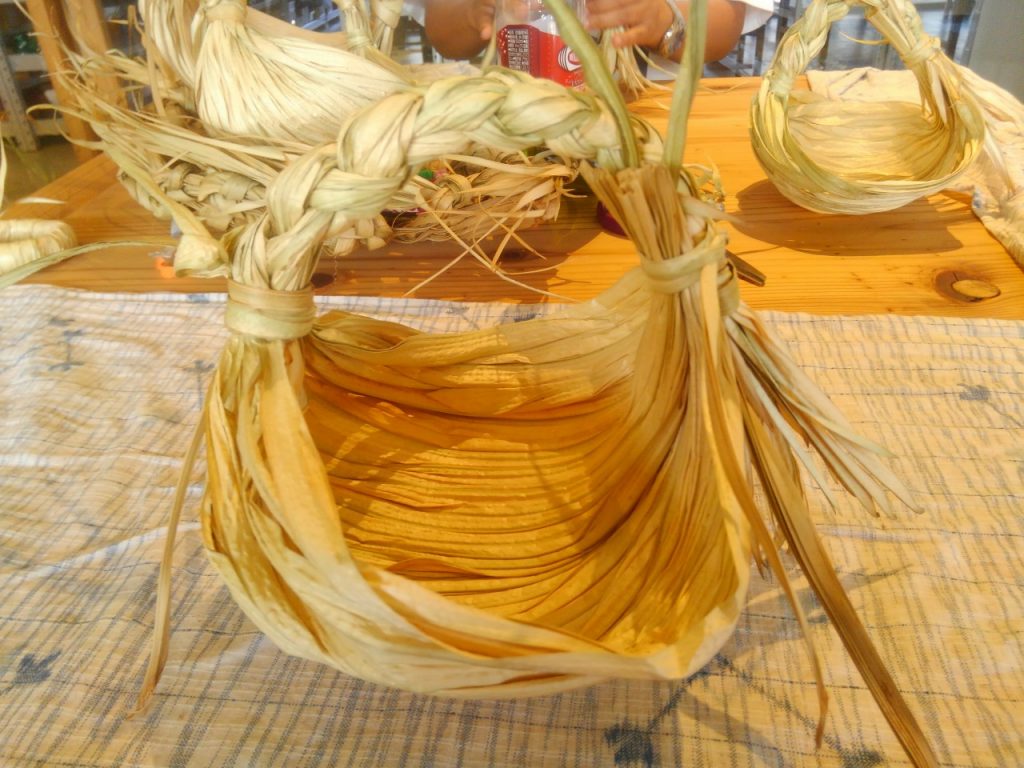 今回は、ワークショップで、クバ籠作りに挑戦。新芽の部分を使って、可愛いらしい、籠作り体験。