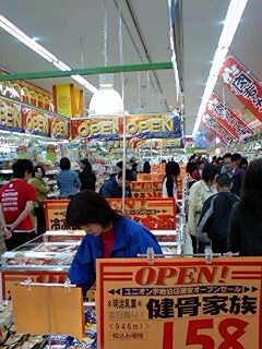 24時間スーパー ユニオン。宇地泊店(コンベンションセンター近く)の開店で冷凍食品半額など嬉しいセール中。人がいっぱいです。私もつい、いつ食べるかわからない唐揚げやドリンク、セール対象になっているビールや99円のマカロニサラダなんか買ってたり。