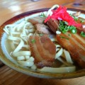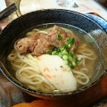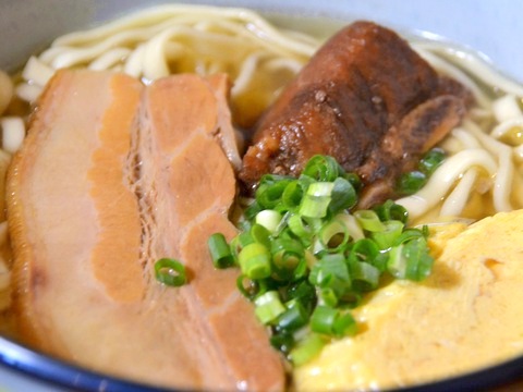 どっしりとした器に盛られている沖縄そばは、大ぶりな骨付きソーキと三枚肉、そして出汁巻き卵がトッピングされています