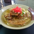 豚骨ベースのスープは、コシの強い平麺の存在感に負けないコクがあり、甘めの味付けです