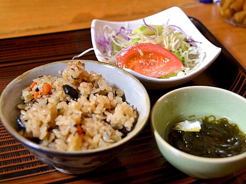入店し席に着くと、店員さんがジューシーとサラダ、モズクを運んできてくれます
