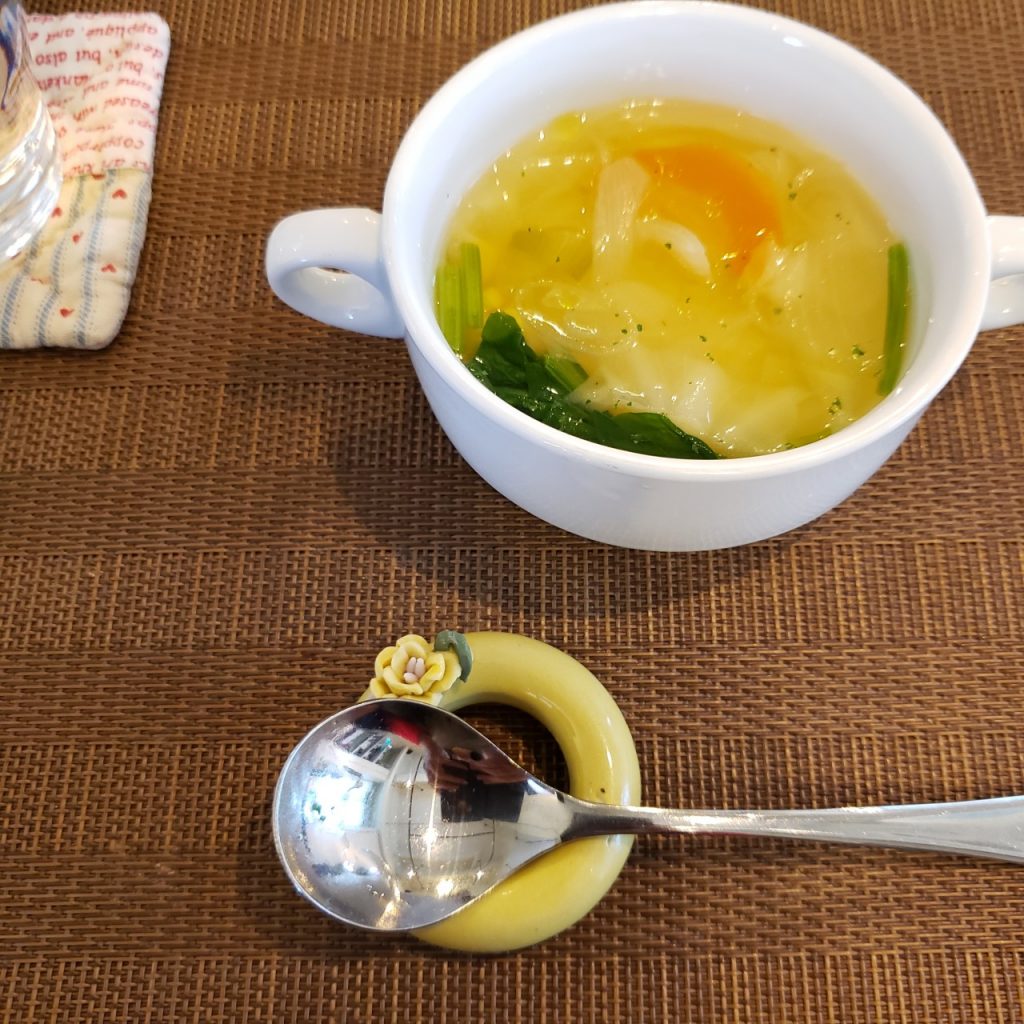 最初のスープ。野菜たっぷりで身体に染みる美味しさ