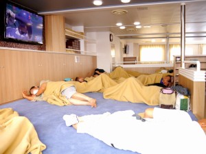 船内をまわってみたが、椅子席は既に空きがなく、座席 (床席)に寝ている人々の間にポツポツ隙間があったので、 とにかくそこに座ることにした。