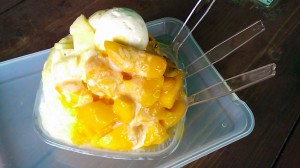 フルーツもマンゴー、パイナップル、パッションフルーツともりもり。ミルクがかかっているのかと思いきやカルピスでびっくり。