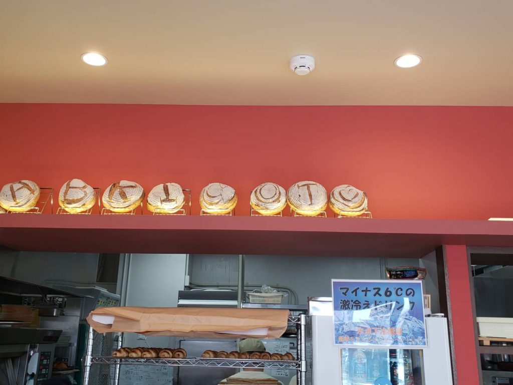 店内のレジの上にはお店の文字が入ったパンが飾ってありました