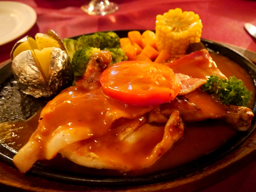 写真はチキンのグリル。デミグラスソースorオリジナルソース(みそ風味だったかな?)を選ぶという事で、デミをセレクト。でも、脂の少ないお肉だったので、オリジナルソースがもしかしたら合ってたかもなー。