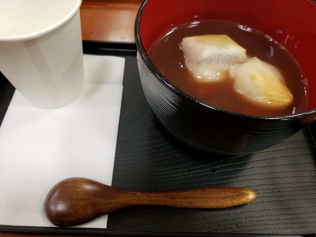 金時豆の優しい甘さと、焼き立ての、お餅が入っていて、美味しかったです。