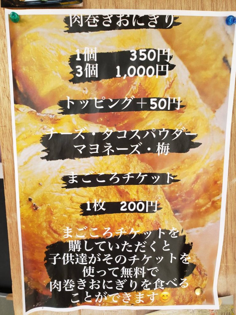 チケットを購入した、お客様は、店前のコルクボードに、貼って頂き、そのチケットは、食べ盛りの子ども達が、チケットをはがし、スタッフに渡すと肉巻きおにぎりと交換できるとの事です。