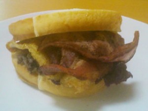 ベーコンと目玉焼きとレタスがサンドされれたボリュームたっぷりなの。