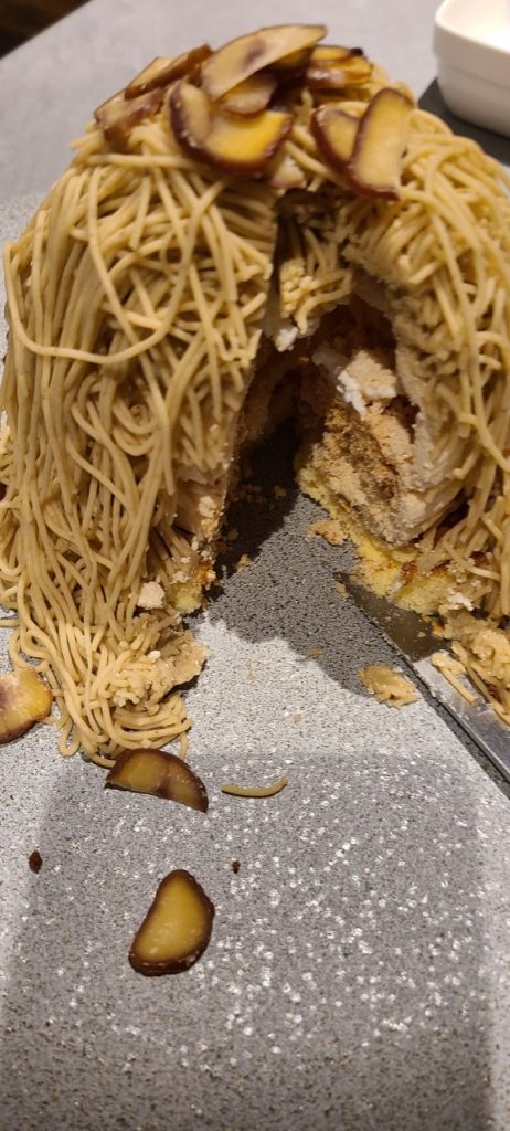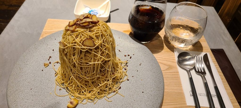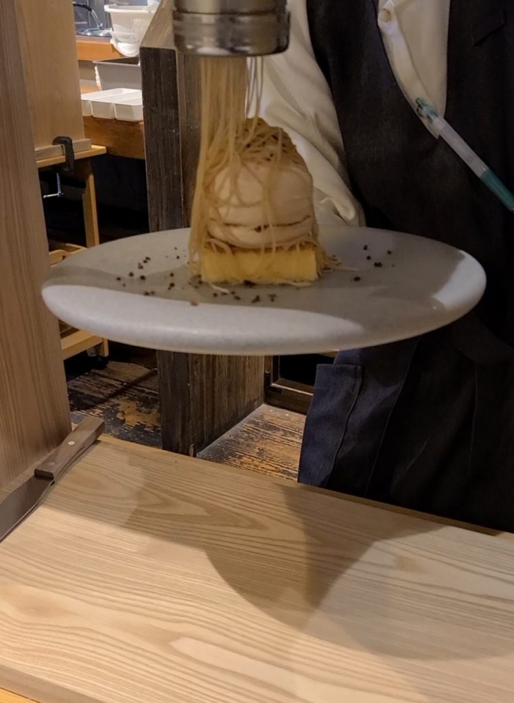 目の前で、機械の箱を持って来て、モンブランを絞り出してくれます。