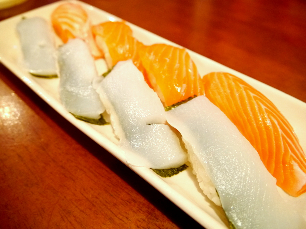 お寿司はおまかせ5貫というメニューがあったので、それを2皿と、サーモン、イカを各2つ頼みました。お寿司は1つで2貫なのかな?サーモン、イカがズラッと出てきた時、あれ?と気づきました。