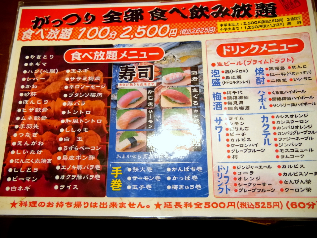焼き鳥・串焼き食べ放題、さらに寿司食べ放題、飲み放題もついて2625円!*と超リーズナブルなお値段に惹かれ、串角 北谷店へ行ってきました。