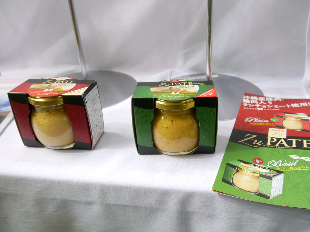 ZuPATE ポーク&チキンパテ(南国食楽Zu)「県産豚、鶏肉を使用のランチョンミート、宮古島の塩を原料にした加工品」プレーン(赤)とバジル(緑)、レバーペーストにたいにトーストに塗って食べたりするみたい。美味しそうーー!!