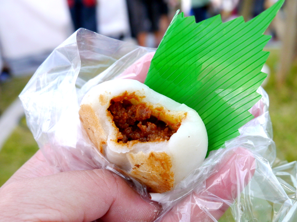 タコスチーズ、ゴーヤーカレー、紅イモ、パインシナモン、もずくのあんかけ など様々な餡をお餅で包んで焼いています。