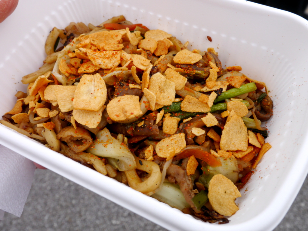 焼きうどんの具材に豚モツ、ニラ、人参、キャベツ、ガーリックチップをたっぷり散りばめた一品。