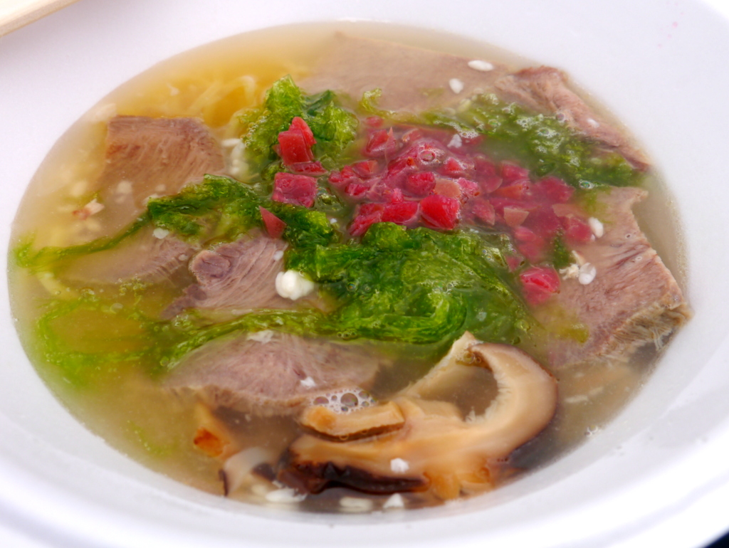 温かなラーメンが食べたくてセレクト。柔らかな牛タン、麺、アオサ、椎茸。見本ではコーンでしたが、代わりに赤いのが入っていました。なんだろう?ポツポツと浮いている白い粒、これが米麹の米。