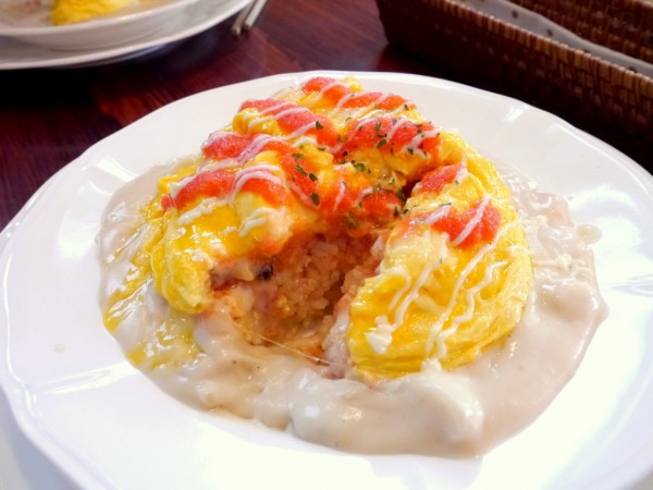 皿から溢れそうな濃厚ホワイトソースの上に、食欲そそる色鮮やかな赤・黄のフワトロ玉子と明太子ソース。3種のソースが選べる「とろとろたまごのオムライス」1,100円から私がセレクトしたのは「明太子シーフードホワイトソース」(大盛り)。他の2つはチキン(ホワイトソース)とビーフシチューとなっています。