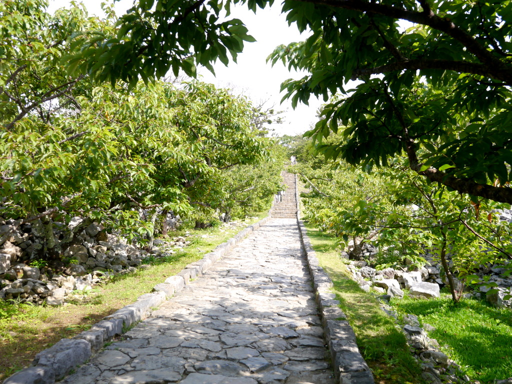 現在の階段は戦後、戦災文化財の修理で整備されたものだそうです。参道の桜は北部の桜三大名所の一つとして有名で、今帰仁グスク桜まつり(1月下旬~2月上旬)開催中は桜のライトアップが行われ、昼とは異なる美しさが楽しめます。