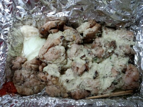 地鶏ではないため、柔らかなもも焼きといった所です。しかし、炭火焼きの香り良く、とってもジューシーで、塩加減がピッタリ☆☆☆付け合わせにキャベツ付きで、柚子胡椒とマヨネーズが隅の方に!