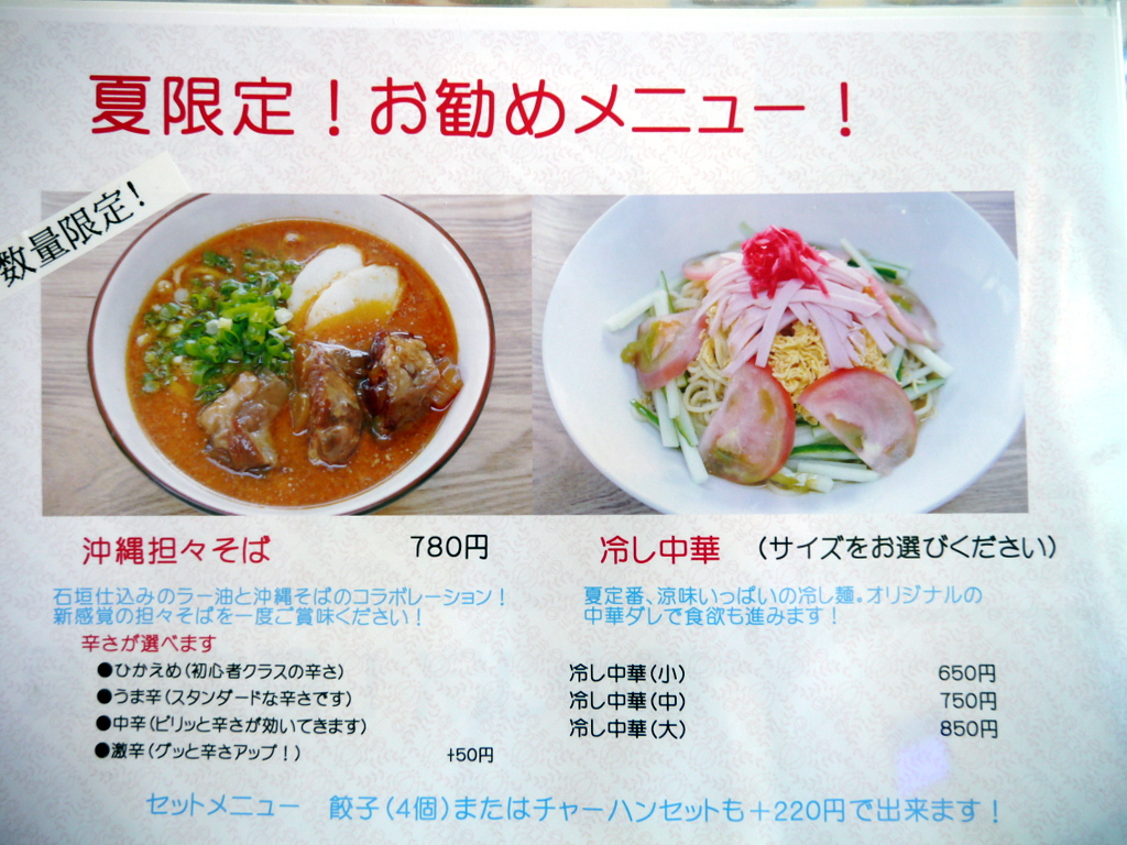 担々麺、純粋醤油ラーメン、石垣の塩ラーメン、チャーシュー麺、ネギチャーシュー麺、ネギ塩チャーシューメン