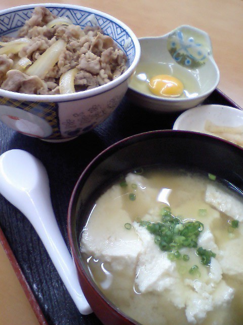 牛丼(並)+玉子+お新香+ゆし豆腐のAセット580円をオーダー