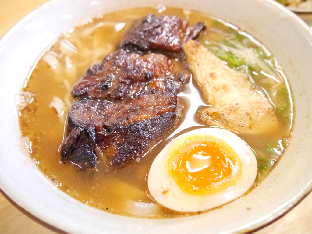 何日もじっくり煮込むという軟骨ソーキ。肉・軟骨ともにトロッと柔らかく、融合して口の中へ溶けていきます。備長炭で炙るソレは、旨味が凝縮されるように香ばしく良い仕上がり。柔らかな味付玉子もGood!ですが、器の全てが主張しすぎ…とも思いました。