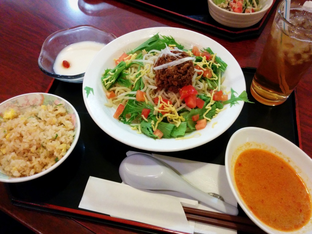 冷やし担々麺(右下はタレ)にミニチャーハン、杏仁豆腐、ソフトドリンク(写真は烏龍茶)がセットでえーっと1,000円しなかった筈。(^^;