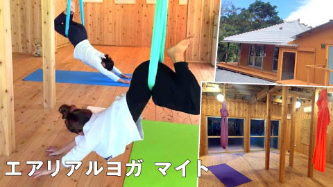 やんばるの森の中にある沖縄伝統的建造物《古民家》でハンモックを使って行うエアリアルヨガ!ハンモックが自然と体をサポートしてくれるので、通常の床上で行なうヨガやストレッチよりも楽に全身運動をすることができます。